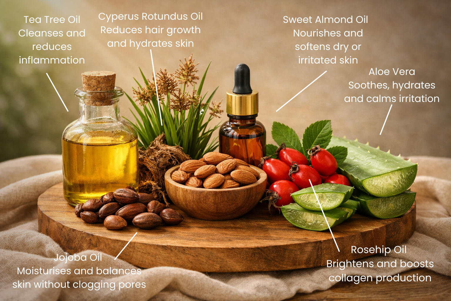 Cyperus Rotundus, Tea Tree, Jojoba, Almond, and Rosehip Oil with Aloe Extract