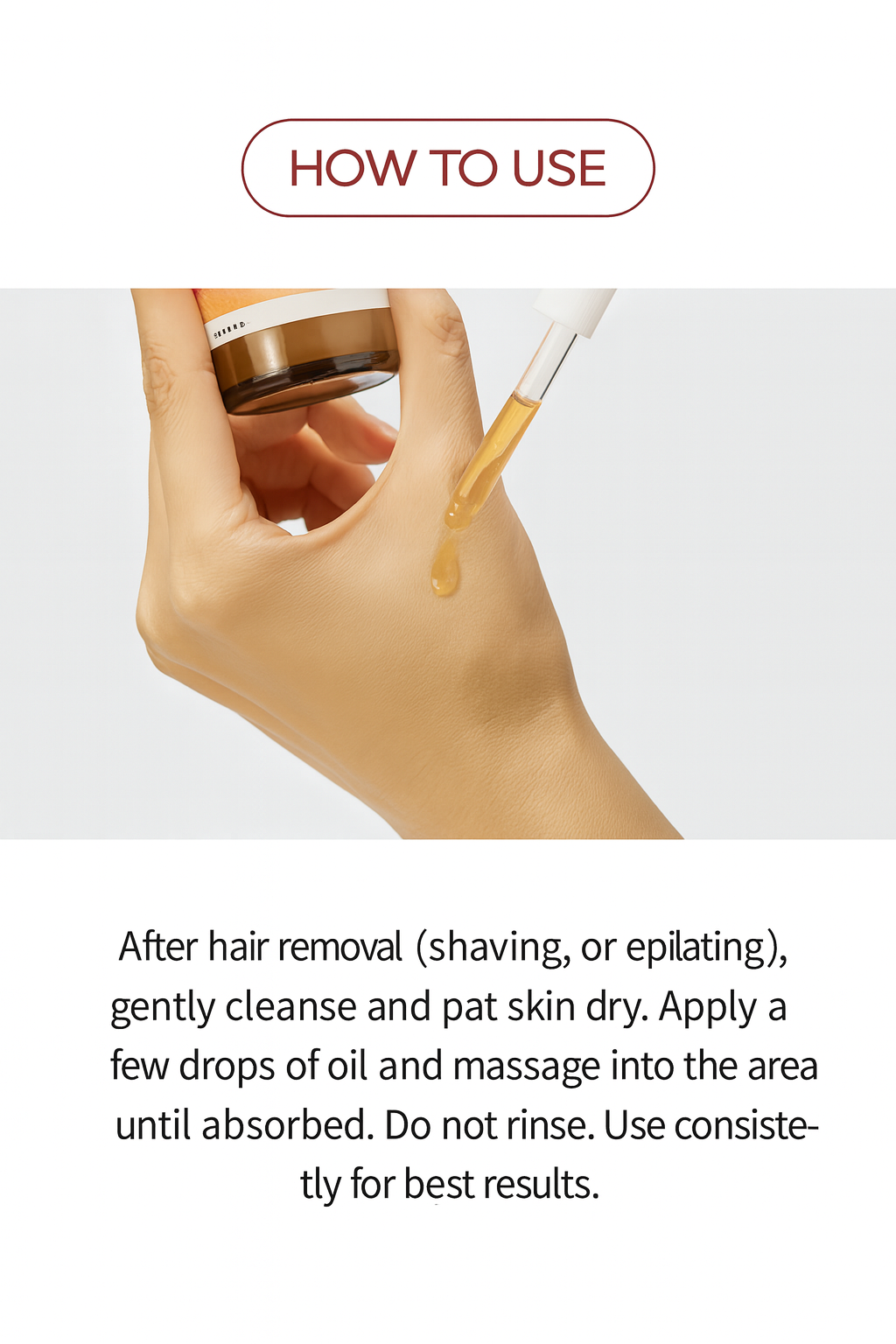 - After hair removal (night): Apply 2–3 drops onto clean skin and massage for 1–2 minutes.