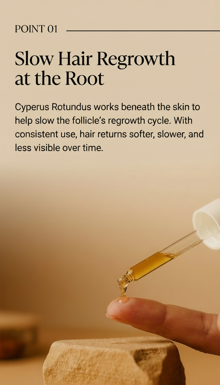 (*Based on published clinical research on Cyperus Rotundus and hair inhibition)